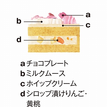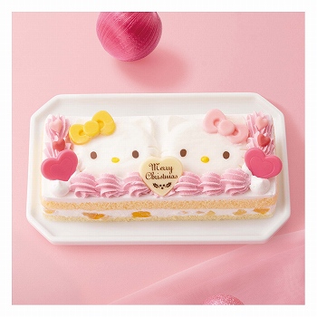 縦約7.5cm×横約18cm×高さ約4cm。りんごと黄桃のシロップ漬けをサンドしたケーキにミルクムースのハローキティ&ハローミミィをトッピングしました。■特定原材料/卵・小麦・乳成分 ※えらべる5%オフの日クーポン対象外です