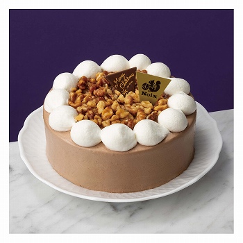 直径約12㎝×高さ約5㎝。プラリネムースを使用し、カラメリゼしたくるみをトッピングした贅沢な木の実のチョコレートケーキです。■特定原材料/卵・小麦・乳成分・くるみ ※えらべる5%オフの日クーポン対象外です