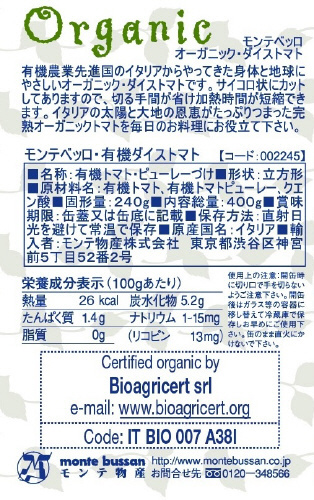 南イタリア産オーガニック・トマトの缶詰です。甘みの強い丸型の完熟有機トマトを湯むきしてさいころ状にカット。切る手間と加熱時間の短縮を可能にした、利用範囲の広い缶詰です。有機JAS認定食品。