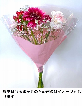 洋花を組み合わせた45cm程度のピンク系のブーケです。花材はおまかせのため画像と異なります。楽宅便限定、お花の栄養剤【クリザール】をプレゼント。