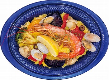 彩り野菜と海老・ほたて・あさりを盛り込んだパエリアです。