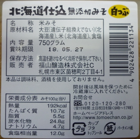 福山醸造 トモエ 北海道仕込み白粒カップ 750g
