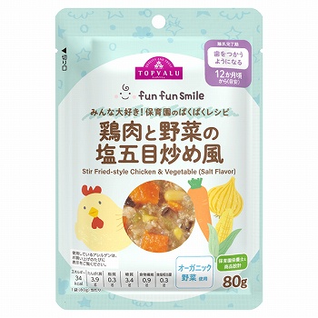対象月齢:12か月頃~/具材感ある塩五目炒め風。純輝鶏使用野菜(有機玉ねぎ、有機にんじん、有機ブロッコリー、有機とうもろこし)、鶏肉(国産)、米でん粉、昆布だし、干ししいたけ、食塩■特定原材料等28品目:「鶏肉」の成分を含んだ原材料を使用。