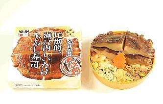 広がる香りと驚きの椎茸煮、その下には華やかな彩りのちらし寿司です。