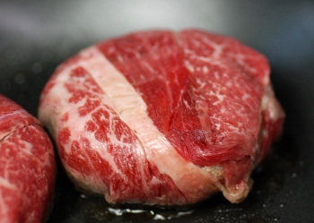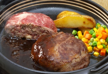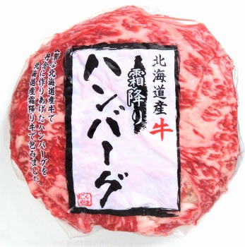 北海道の豊かな大自然で育った、安心・安全な北海道牛使用。さらに材料も北海道産玉葱、北海道産卵、北海道の牛乳、肉の山本オリジナルの特製スパイスを混ぜ込み、ひとつひとつ丁寧に手作業で作り、出来上がったハンバーグを北海道産霜降り牛肩ロースで包み込みました。