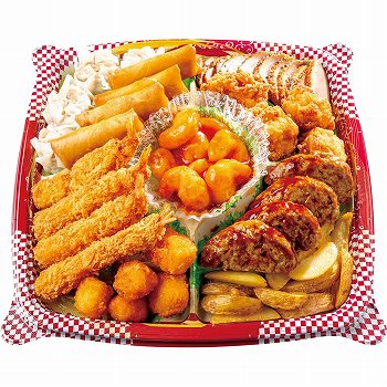 横300mm×縦300mm。エビフリッターチリソース・合鴨パストラミ・エビフライ・中華春巻・肉焼売・鶏唐揚げ・ひとくちイカフライ・フライドポテト・ハンバーグ ■特定原材料/小麦・卵・乳・えび・かに ※えらべる5%オフの日クーポン対象外です