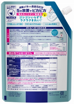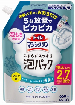 泡パックで簡単にトイレ掃除ができ、消臭効果もあります。逆さスプレーでフチ裏もきれいにし、サボン&シトラスの香りが楽しめます。
