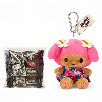 ハワイアンホースト「マカダミアナッツチョコレート」とマスコットホルダーのセットです。カラビナ付きです。マスコットホルダーは日焼けしたキャラクターとハワイアンな雰囲気のハイビスカス柄の衣装がポイントです。
