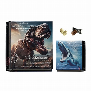 迫力のある恐竜ブック缶に、タマゴチョコとミルクチョコクランチが入っています。