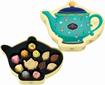 小さな花束が描かれたティーポッド型の箱にチョコレートを詰合せです。