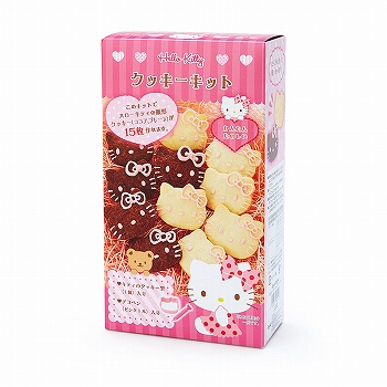 プレーン、ココアの2種類のハローキティの顔形のクッキーが約15枚作れるクッキーキットです。ハローキティの顔形のクッキー抜き型入り。