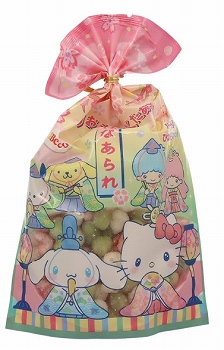 サンリオキャラクターがデザインされた巾着型ひなあられです。飾って楽しめる可愛らしいデザインで、ひな祭りにぴったりです。