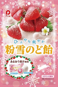 あまおう果汁を使用した苺味ののど飴です。ひんやりパウダーで独自の食感が楽しめ、優しい味わいと9種類のハーブエキスでのどうるおい効果も期待できます。