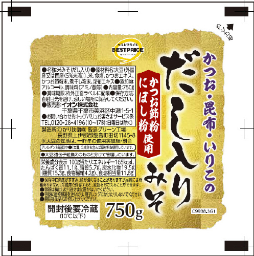トップバリュ 塩分25%カット だし入り味噌 750g
