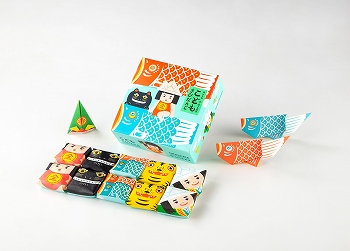 金太郎、熊、鯉などなど。こどもの日にちなんだプレミアムパッケージのきびだんご。箱を開けるとこどもの日にちなんだデザインが次々に飛び出しお楽しみいただけます。鯉や兜といったCOCHAEのかわいい折り紙つきになります。お味はプレーンです。